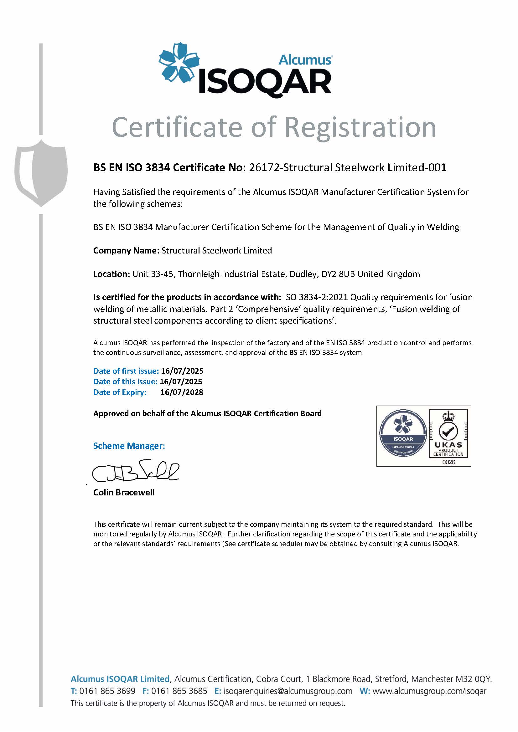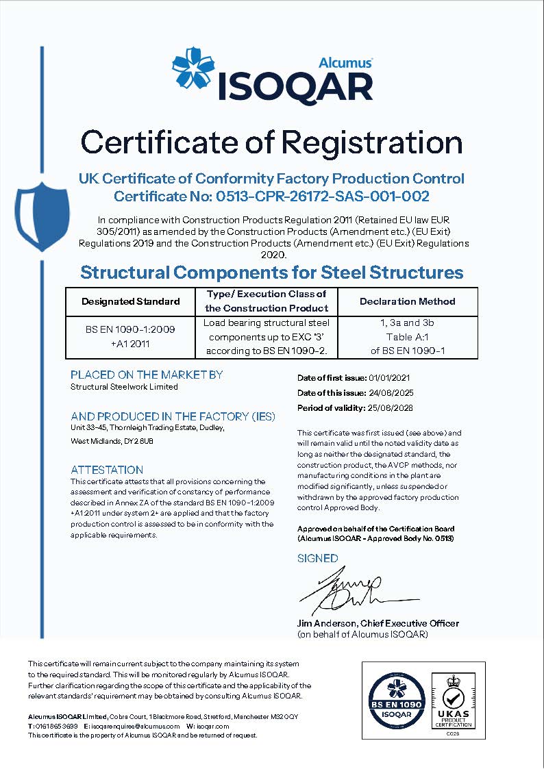 Structural Steelwork Ltd has achieved CE Marking Accreditation Standard EN 1090-1:2009+A1:2011 Execution Class 2, for Welded Structural Steel Components intended for load bearing applications.