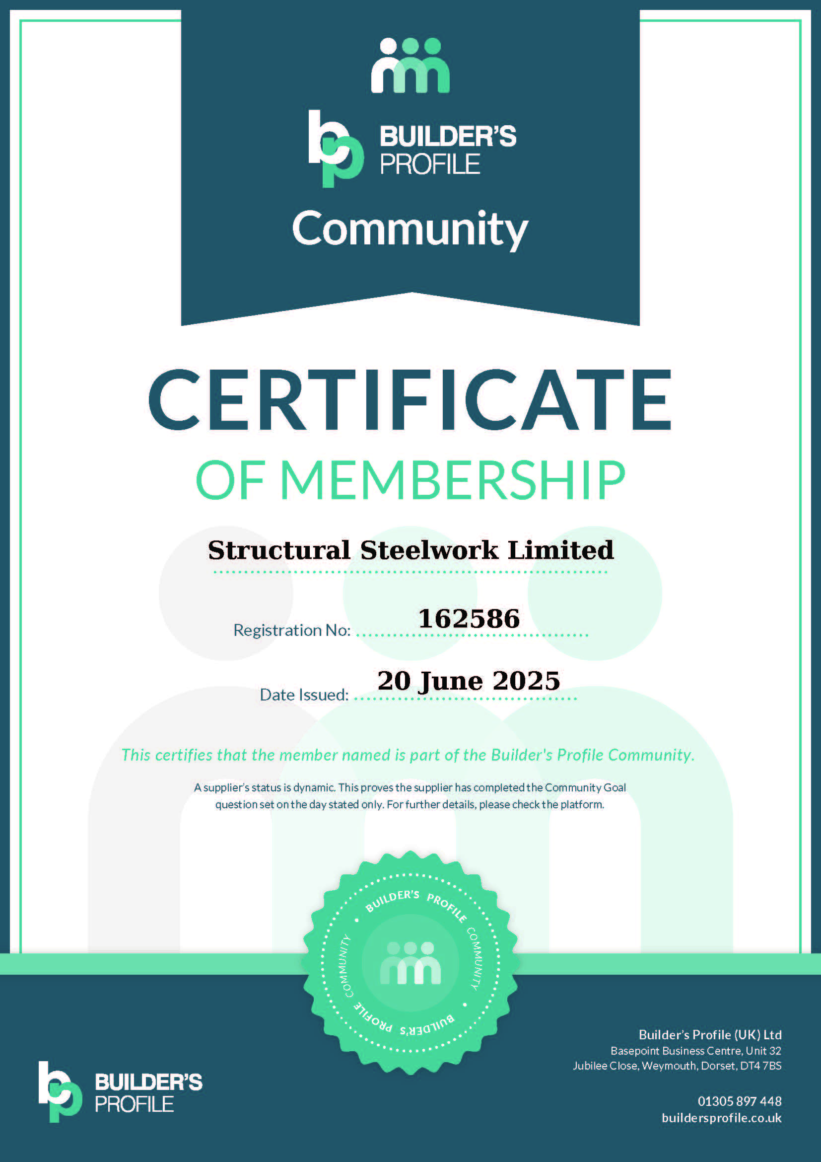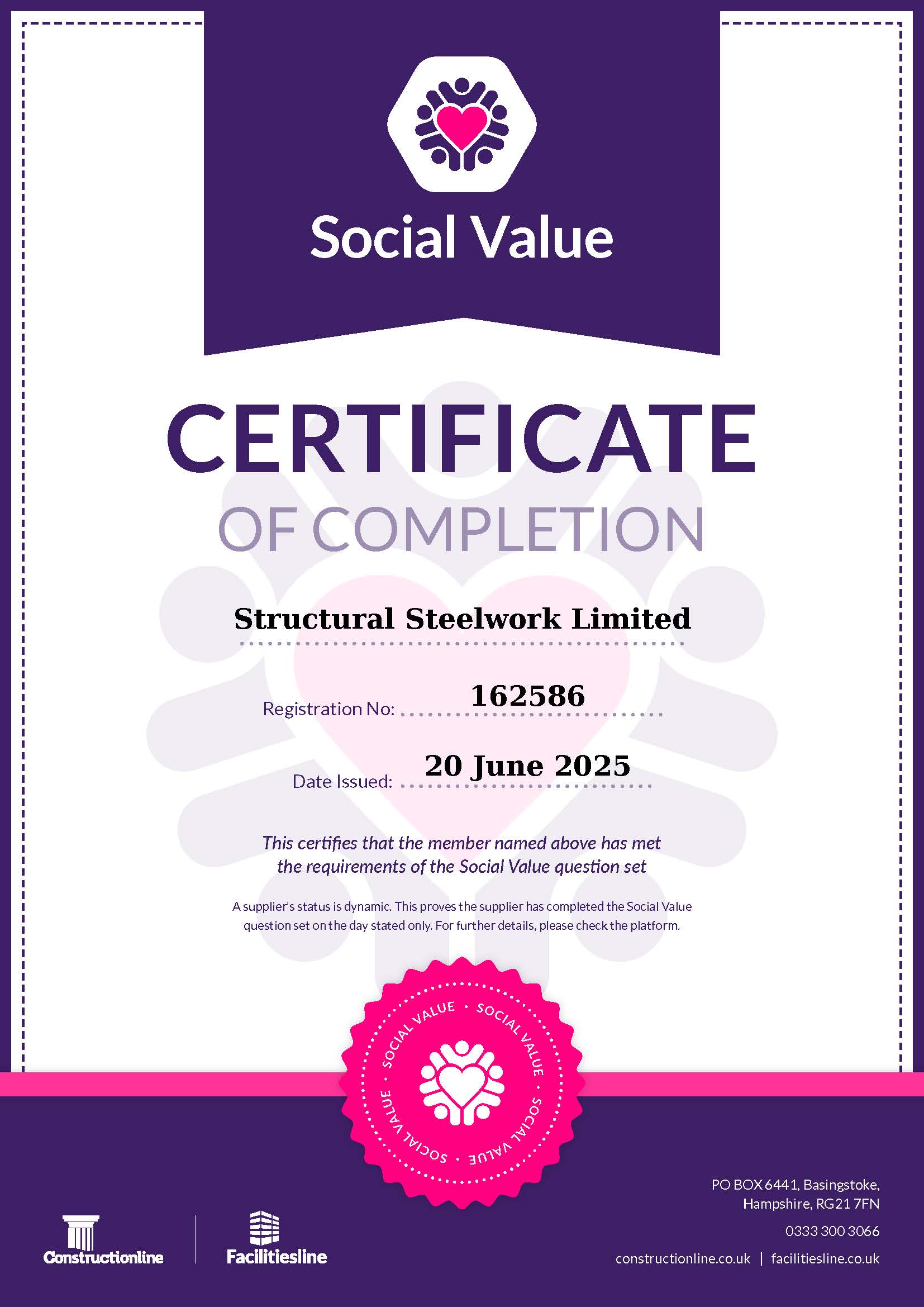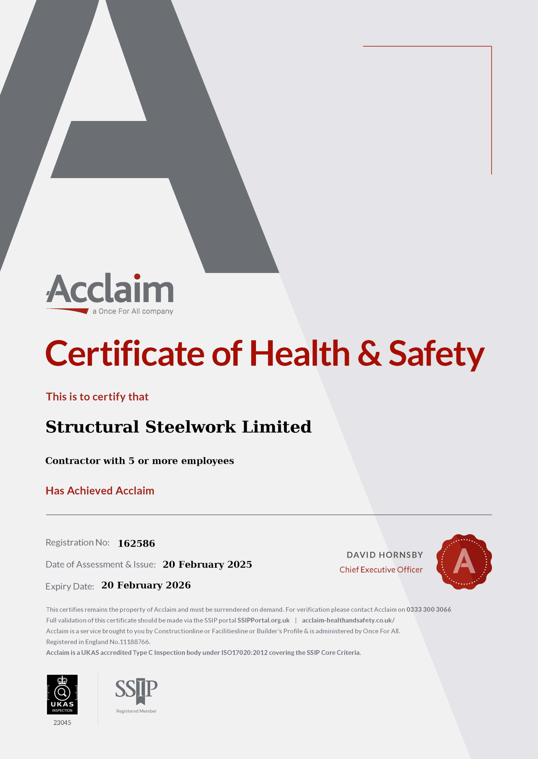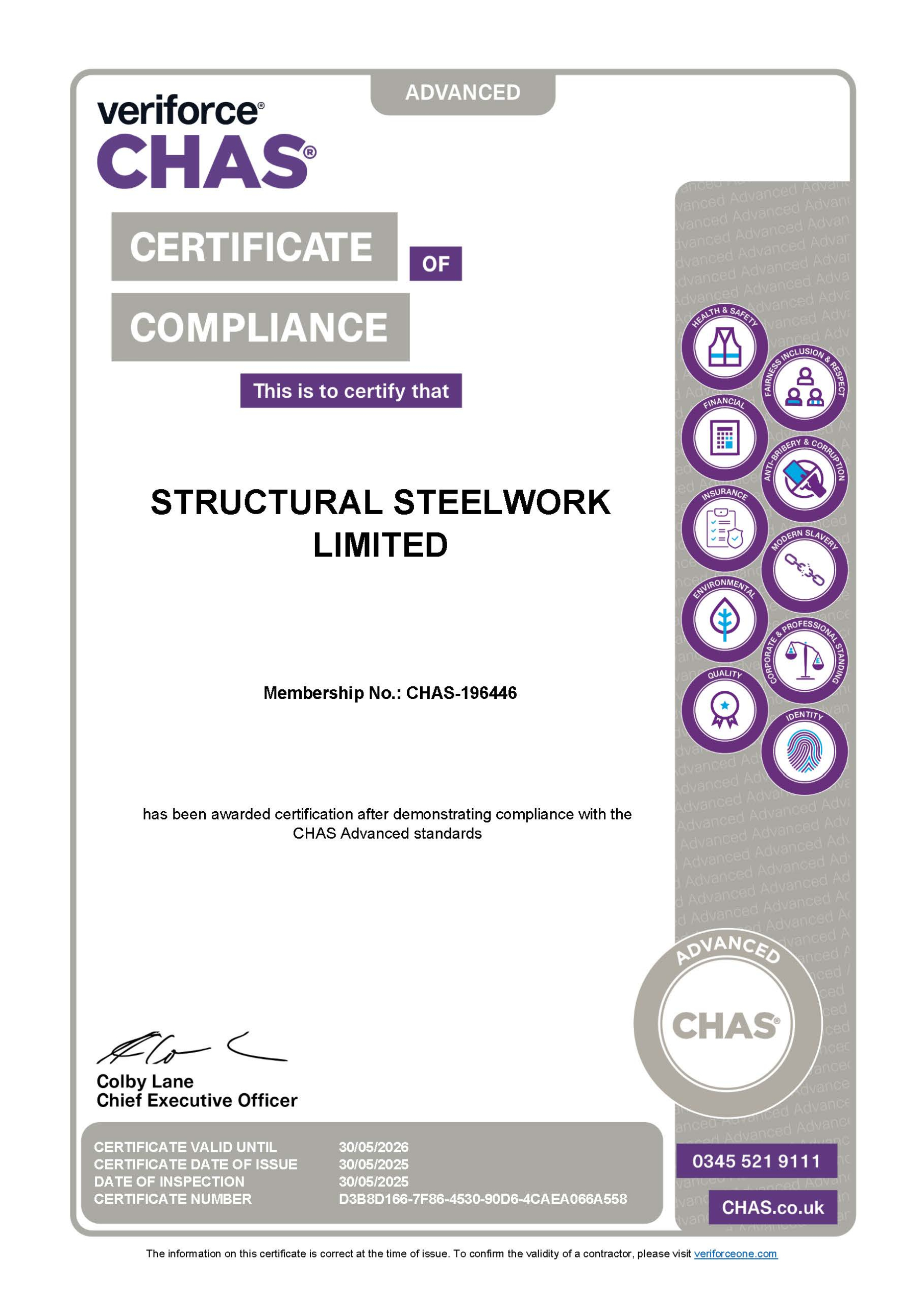 Structural Steelwork has been awarded certification after demonstrating compliance with the CHAS standards in line with the requirements of SSIP Core Criteria and UK H&S Legislation. The company has demonstrated full compliance with nine modules of PAS 91.